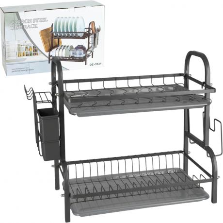 Настольная двухъярусная сушилка для посуды предназначена для удобного размещения и сушки тарелок, чашек и кухонных принадлежностей. Размер сушилки без держателей — 43×25×42 см. В комплект входит пластиковый поддон для ложек с отверстиями для слива воды размером 5×7×12 см, металлический держатель для ножей, лопаток и других кухонных принадлежностей размером 15×13×5 см, оснащённый 4 крючками, а также держатель для разделочных дощечек. Конструкция устойчивая и практичная, подходит для размещения на столешнице.