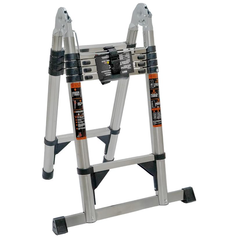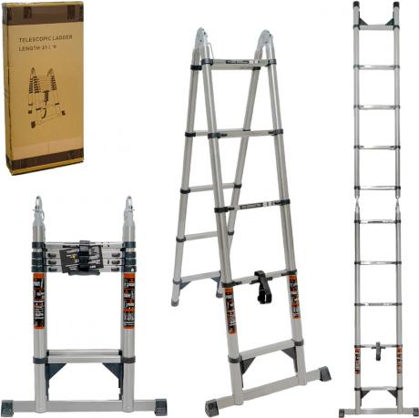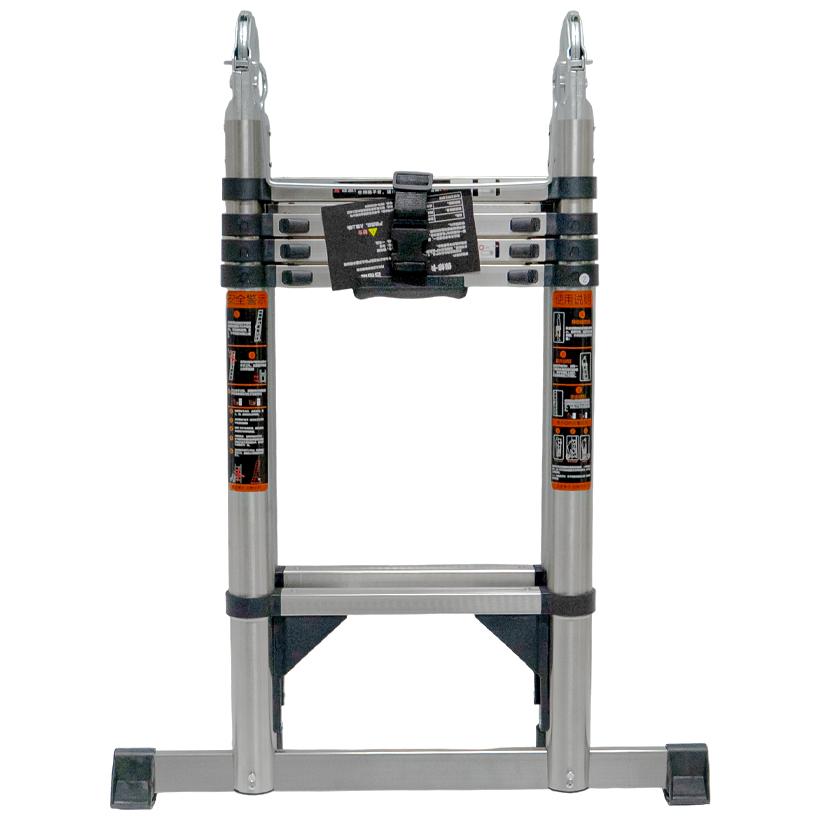 Телескопическая лестница из нержавеющей стали с высотой 2,1 м + 2,1 м складывается в компактную форму, фиксируется ремнями, удобно переносится благодаря ручке. Рабочая нагрузка — до 150 кг. Может использоваться в виде классической стремянки (форма «А») или в виде конструкции «Г» — для работ в труднодоступных местах и возле стен. Ширина — 40 см. Вес — около 15 кг. В комплект входят 2 запасных фиксатора. Подходит для дома, ремонта, стройки, дачи. Упаковка: 46×13×98 см.