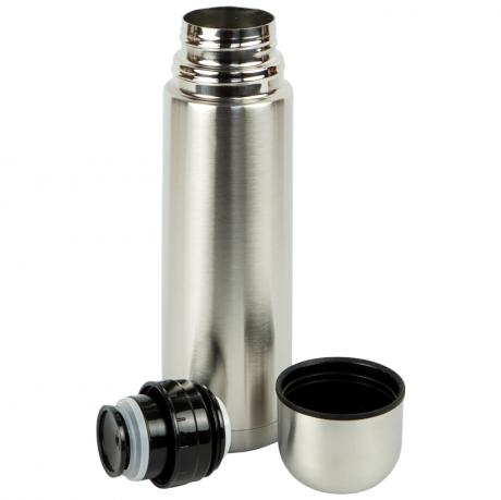 Корпус выполнен в стальном цвете, отличается прочностью и устойчивостью к коррозии. Крышка используется как чашка, что удобно в поездках и на природе. Под крышкой расположена кнопка для питья, позволяющая наливать напиток без полного откручивания пробки.
