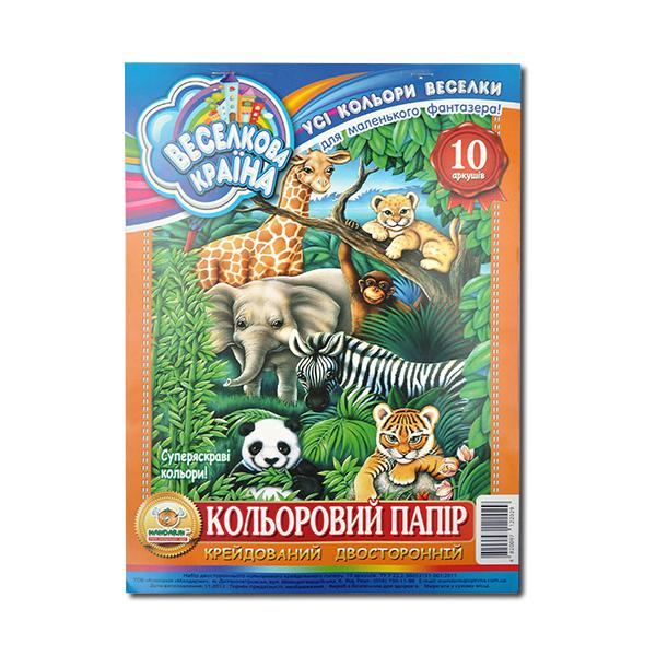 Набор разноцветной мелованной цветной бумаги, на скобе, формат А4, 10 листов, 10 цветов по 2 листа каждого цвета. Цвета: желтый/зелёный, красный/оранжевый, синий/голубой, розовый/малиновый, фиолетовый/черный. Набор цветной бумаги подходит для аппликаций, вырезаний, склеивания.