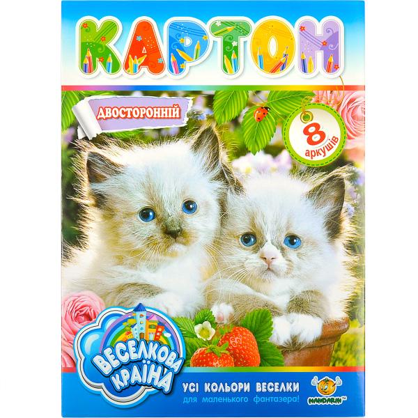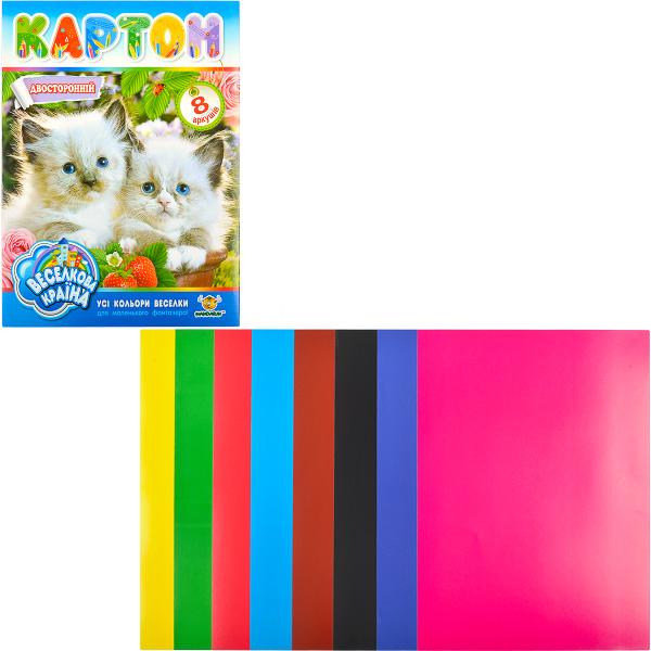 Набор цветного двустороннего картона в бумажном конверте, 8 листов, формат А4, плотность картона 230гр. Один лист - один цвет. Подходит для аппликаций, вырезаний, склеивания. Развивает мышление, моторику рук и фантазию. Яркие цвета.