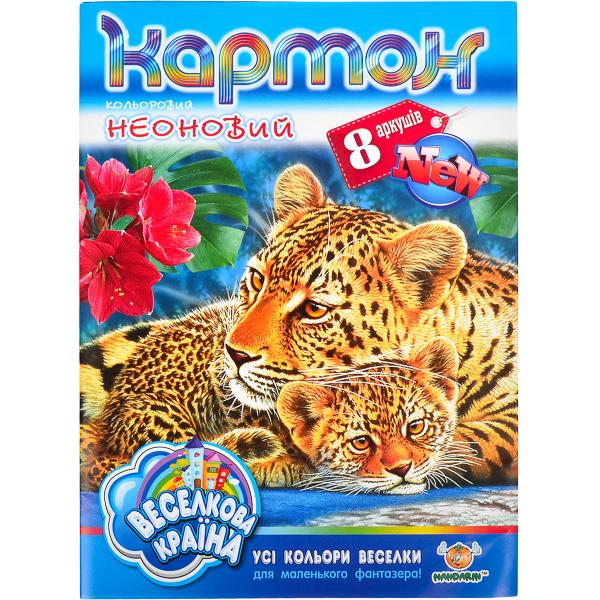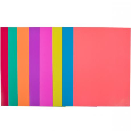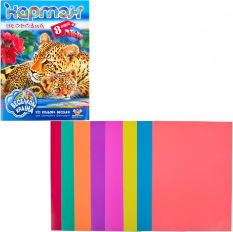 Набор цветного неонового картона в бумажном конверте, 8 листов, формат А4, плотность картона 230гр. Подходит для аппликаций, вырезаний, склеивания. Развивает мышление, моторику рук и фантазию. Яркие неоновые цвета: оранжевый, зеленый, синий, розовый, желтый, красный, малиновый, сиреневый.