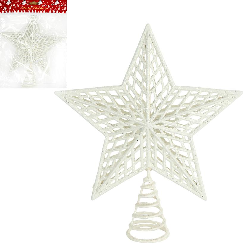 Пластиковая новогодняя верхушка в виде звезды — эффектное украшение для ёлки, которое станет центральным акцентом в праздничном декоре. Размер изделия — 23×20 см. Белая звезда с глиттером выполнена в ажурном дизайне и легко устанавливается с помощью спиралевидного основания. Украшение лёгкое, устойчивое и подходит для ёлок любого типа. Идеальный выбор для дома, офиса или витрины.